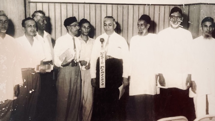 Radio Demerara Program. Standing: left to right, Moulvi Hukumdar, Brothers Sabit Ali Khan, Ala Baksh, Haji S.M. Shakoor, MBE, Haji