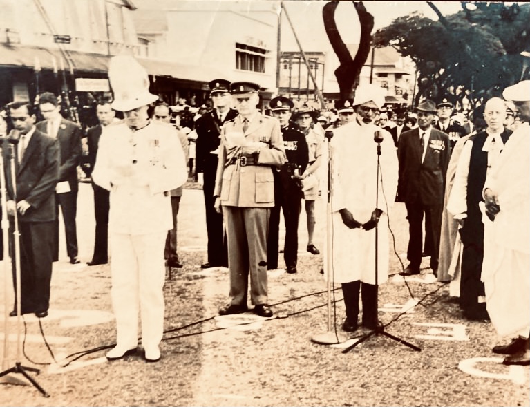 Interfaith Remembrance Day Ceremony. Standing: left to right: at microphone, Minister Balram Singh Rai, Governor Sir Ralph Grey (in